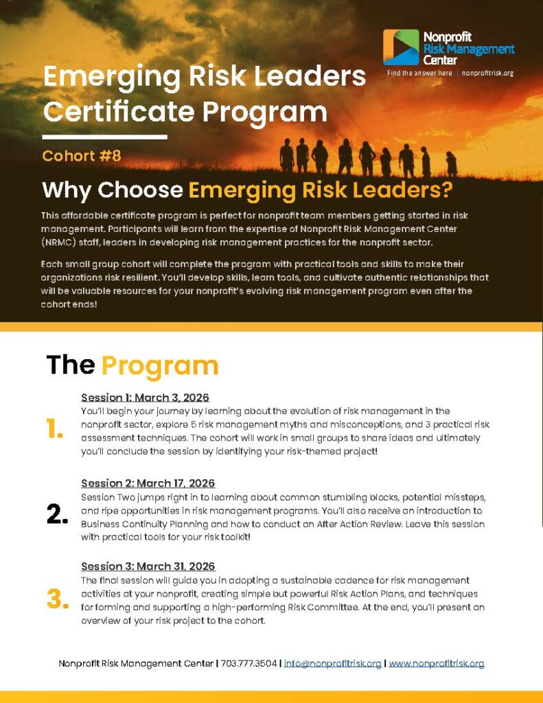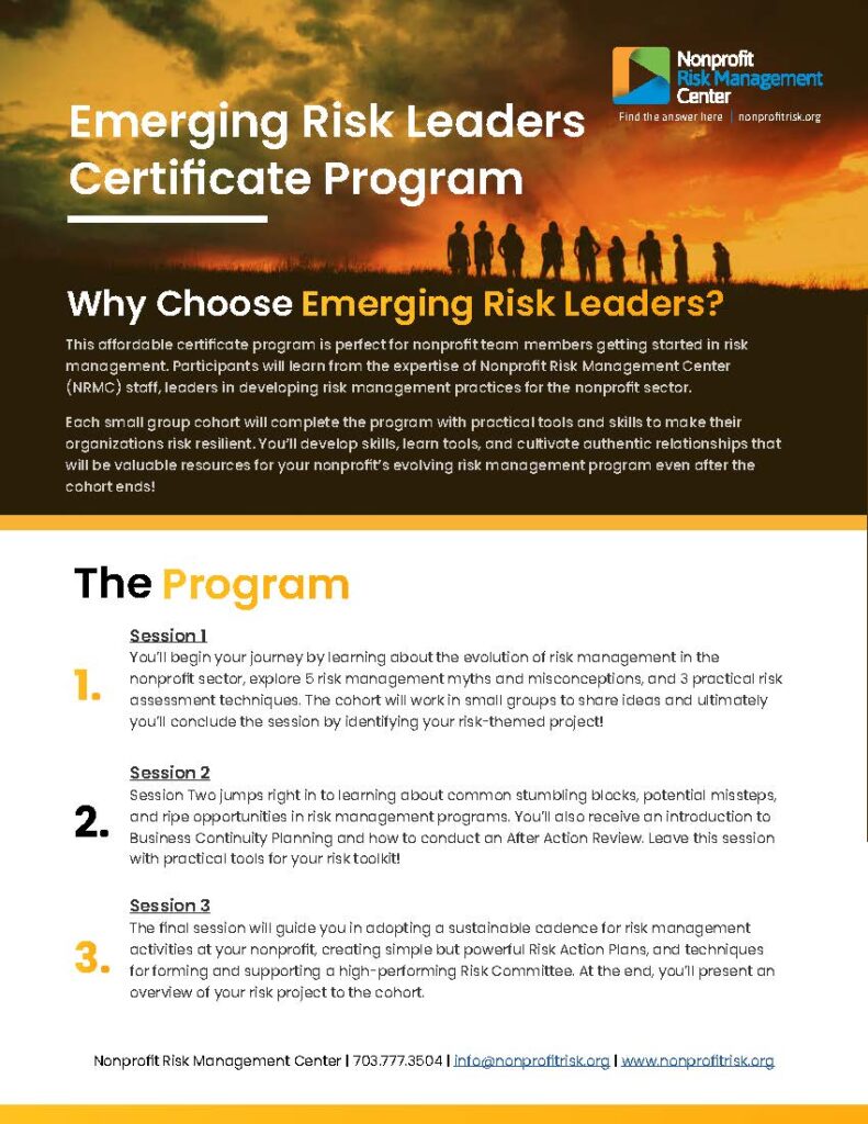 ERLCP–the Emerging Risk Leaders Certificate Program–is an intensive, interactive learning experience designed for nonprofit professionals who want to hone their risk skills and understanding. Curiosity and and an open mindset are required, but we do not require that you have any prior risk management training or experience.